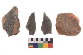 | Description / विवरण | There are n-4 of utilized flake cores. There are multidirectional irregular dominant scar pattern on both dorsal and ventral face of the cores. Some of them bulge of percussion and some are flat flake cores. |