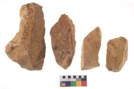 | Description / विवरण | There are n-4 of utilized flake cores. There are multidirectional irregular dominant scar pattern on both dorsal and ventral face of the cores. Some of them bulge of percussion and some are flat flake cores. |