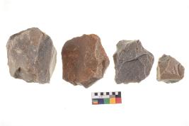 | Description / विवरण | There are n-4 of utilized flake cores. There are multidirectional irregular dominant scar pattern on both dorsal and ventral face of the cores. Some of them bulge of percussion and some are flat flake cores. |