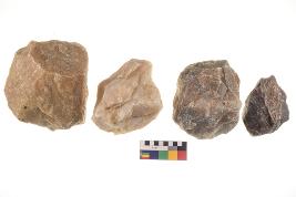 | Description / विवरण | There are n-4 of utilized flake cores. There are multidirectional irregular dominant scar pattern on both dorsal and ventral face of the cores. Some of them bulge of percussion and some are flat flake cores. |
