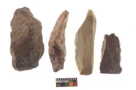 | Description / विवरण | There are n-4 of utilized flake cores. There are multidirectional irregular dominant scar pattern on both dorsal and ventral face of the cores. Some of them bulge of percussion and some are flat flake cores. |