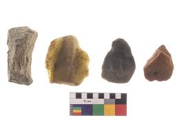 | Description / विवरण | There are n-4 of utilized flake cores. There are multidirectional irregular dominant scar pattern on both dorsal and ventral face of the cores. Some of them bulge of percussion and some are flat flake cores. |