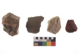 | Description / विवरण | There are n-4 of utilized flake cores. There are multidirectional irregular dominant scar pattern on both dorsal and ventral face of the cores. Some of them bulge of percussion and some are flat flake cores. |
