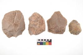 | Description / विवरण | There are n-4 of utilized flake cores. There are multidirectional irregular dominant scar pattern on both dorsal and ventral face of the cores. Some of them bulge of percussion and some are flat flake cores. |