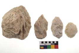 | Description / विवरण | There are n-4 of utilized flake cores. There are multidirectional irregular dominant scar pattern on both dorsal and ventral face of the cores. Some of them bulge of percussion and some are flat flake cores. |