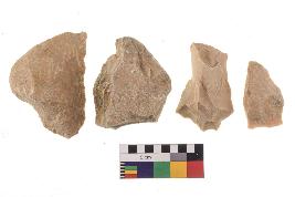 | Description / विवरण | There are n-4 of utilized flake cores. There are multidirectional irregular dominant scar pattern on both dorsal and ventral face of the cores. Some of them bulge of percussion and some are flat flake cores. |