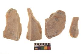 | Description / विवरण | There are n-4 of utilized flake cores. There are multidirectional irregular dominant scar pattern on both dorsal and ventral face of the cores. Some of them bulge of percussion and some are flat flake cores. |