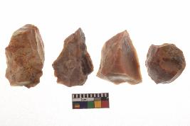 | Description / विवरण | There are n-4 of utilized flake cores. There are multidirectional irregular dominant scar pattern on both dorsal and ventral face of the cores. Some of them bulge of percussion and some are flat flake cores. |