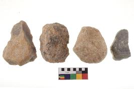 | Description / विवरण | There are n-4 of utilized flake cores. There are multidirectional irregular dominant scar pattern on both dorsal and ventral face of the cores. Some of them bulge of percussion and some are flat flake cores. |
