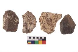 | Description / विवरण | There are n-4 of utilized flake cores. There are multidirectional irregular dominant scar pattern on both dorsal and ventral face of the cores. Some of them bulge of percussion and some are flat flake cores. |