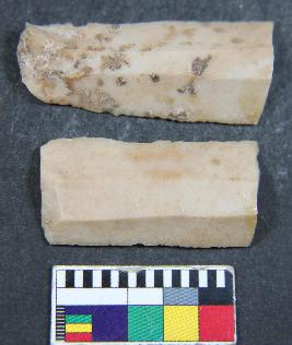 | Description / विवरण | 1. Blade with parallel sides having two dorsal ridges. It has bulb of percussion on the ventral side. 2. Blade with parallel sides having two dorsal ridges. |