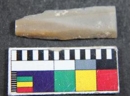 | Description / विवरण | A fragment of micro-sized blade having sharp parallel sides with two dorsal ridge and trapezoidal in section. It has smooth surface. |