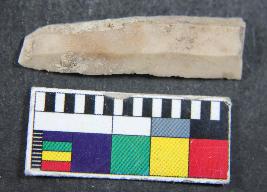 | Description / विवरण | Chert blade showing thick broad parallel sided, one end truncated, two dorsal is present, sharp cutting edges and trapezi in section. Its surface is smooth. |