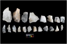 | Description / विवरण | There are n-20 of intact flake cores made up of Quartz. Some of them have bulge of percussion and some are flat flakes. |