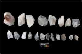 | Description / विवरण | There are n-20 of intact flake cores made up of Quartz. Some of them have bulge of percussion and some are flat flakes. |
