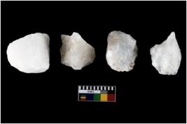 | Description / विवरण | Four utilised worked cores with sharp edges. Flakes removed from almost all the sides. Some are tapering at one end. |