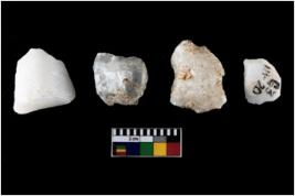 | Description / विवरण | Four utilised worked cores with sharp edges. Flakes removed from almost all the sides. Some are tapering at one end. |