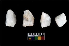 | Description / विवरण | Four utilised worked cores with sharp edges. Flakes removed from almost all the sides. Some are tapering at one end. |