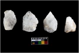 | Description / विवरण | Four utilised worked cores with sharp edges. Flakes removed from almost all the sides. Some are tapering at one end. |