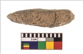 | Description / विवरण | A partially broken specimen of a bone point , it is made on a thick splinter of bone by grinding. The sides also bear rubbing marks. It has a perforation on lower side. |