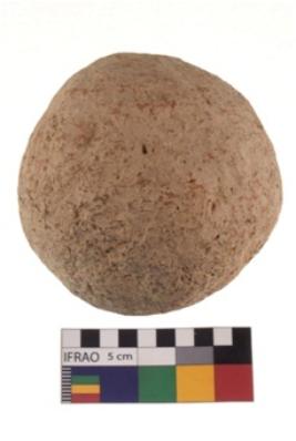 | Description / विवरण | A complete specimen of a sling ball having rough surface and reddish black colour. |