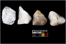 | Description / विवरण | There are n-4 of intact flake cores made up of Quartz. Some of them have bulge of percussion and some are flat flakes. |