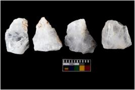 | Description / विवरण | There are n-4 of intact flake cores made up of Quartz. Some of them have bulge of percussion and some are flat flakes. |