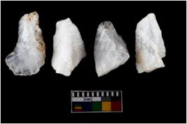 | Description / विवरण | There are n-4 of intact flake cores made up of Quartz. Some of them have bulge of percussion and some are flat flakes. |