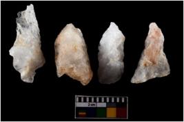 | Description / विवरण | There are n-4 of intact flake cores made up of Quartz. Some of them have bulge of percussion and some are flat flakes. |