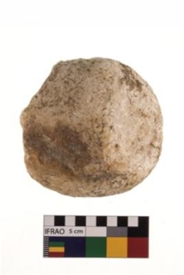 | Description / विवरण | A partially broken specimen of a hammer stone with rough surface, it is made of quartz , it is circular in shape. |
