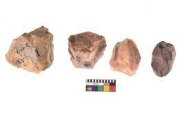 | Description / विवरण | Four utilised worked cores with sharp edges. Flakes removed from almost all the sides. Some are tapering at one end. |