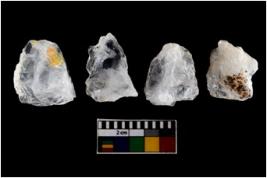 | Description / विवरण | There are n-4 of intact flake cores made up of Quartz. Some of them have bulge of percussion and some are flat flakes. |