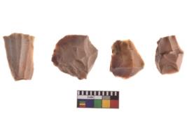 | Description / विवरण | Four utilised worked cores with sharp edges. Flakes removed from almost all the sides. Some are tapering at one end. |