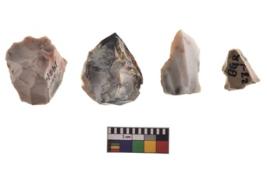 | Description / विवरण | Four utilised worked cores with sharp edges. Flakes removed from almost all the sides. Some are tapering at one end. |