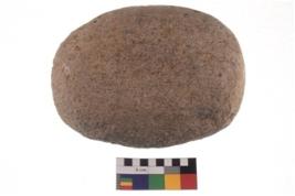 | Description / विवरण | A complete specimen of an oval shaped muller. It has battered surface along with curved ridges and oval section. |