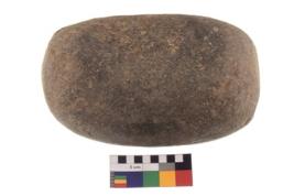 | Description / विवरण | A complete specimen of an oval shaped muller. It has battered surface along with curved ridges and oval section. |
