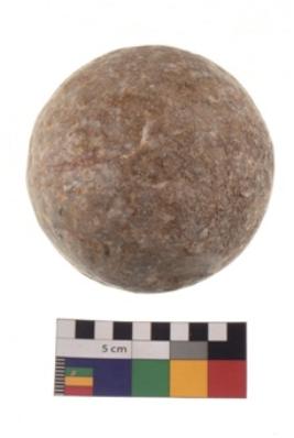 | Description / विवरण | A complete specimen of a sling ball having rough surface and reddish black colour. |
