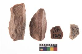 | Description / विवरण | A rectangular flake with wavy thick distal end and broken functional top. It reined pebbly cortex on one side and irregular thin edge on the other. |