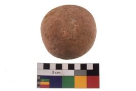 | Description / विवरण | A complete specimen of a sling ball having rough surface and reddish black colour. |