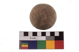 | Description / विवरण | A complete specimen of a sling ball having rough surface and reddish black colour. |