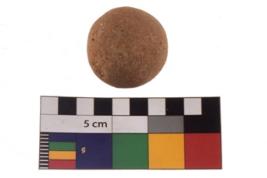 | Description / विवरण | A complete specimen of a sling ball having rough surface and reddish black colour. |