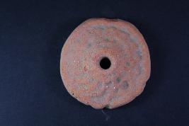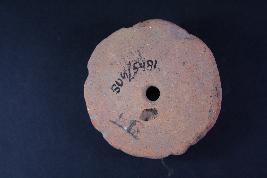 A circular wheel has a hole at the centre, some embossed motifs are given on its surface, the motifs seem to be faded.
