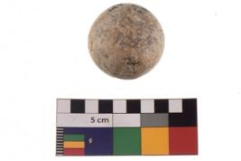 | Description / विवरण | A complete specimen of a sling ball having rough surface and reddish black colour. |