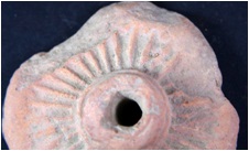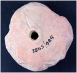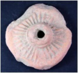 Broken wheel, originally circular in shape but it is damaged on edges, a hole is given at the centre and lines are put all over it.