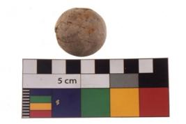 | Description / विवरण | A complete specimen of a sling ball having rough surface and reddish black colour. |