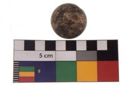 | Description / विवरण | A complete specimen of a sling ball having rough surface and reddish black colour. |
