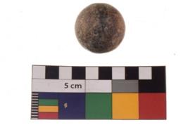 | Description / विवरण | A complete specimen of a sling ball having rough surface and reddish black colour. |