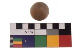 | Description / विवरण | A complete specimen of a sling ball having rough surface and reddish black colour. |