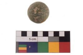 | Description / विवरण | A complete specimen of a sling ball having rough surface and reddish black colour. |