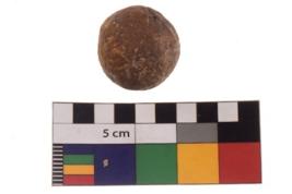 | Description / विवरण | A complete specimen of a sling ball having rough surface and reddish black colour. |